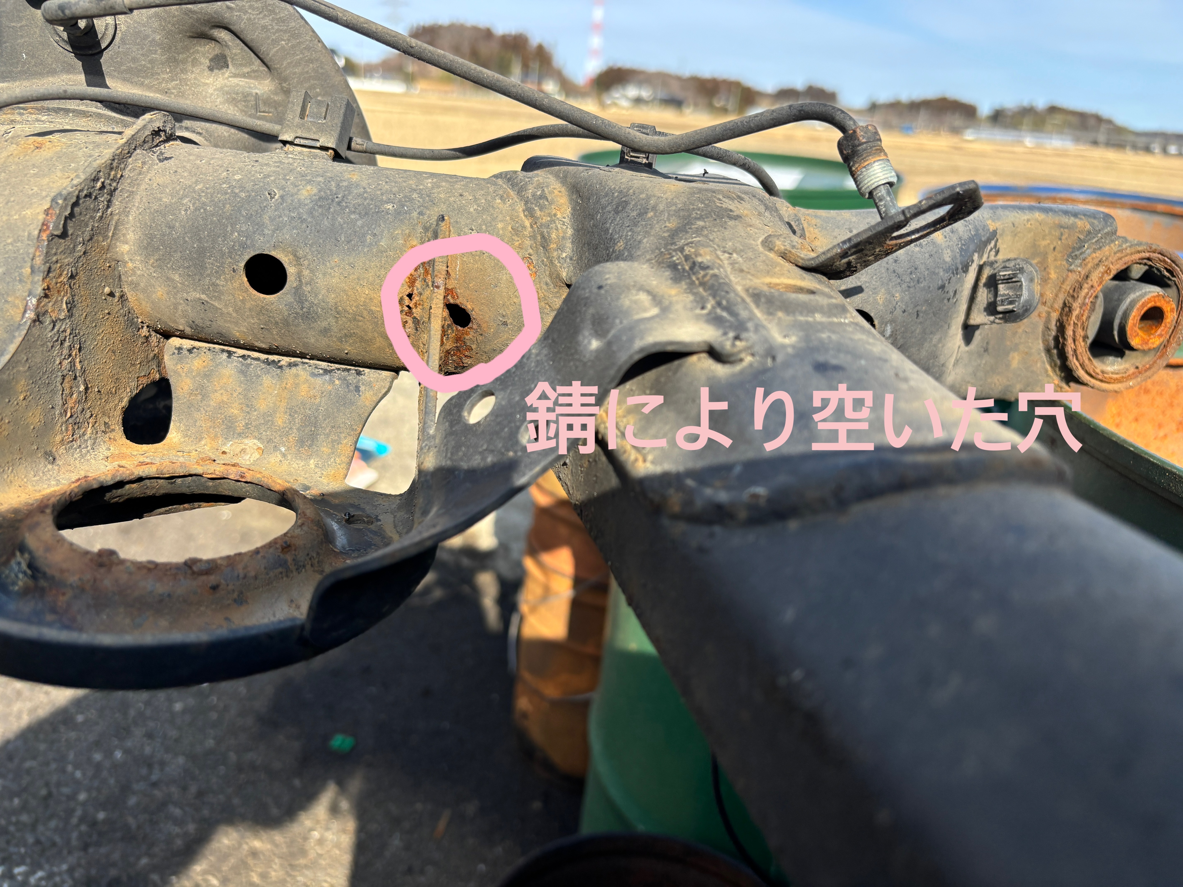 錆びや穴をそのままにしておくと、不良部が広がり軸が折れ、脱輪などの恐れがあります。